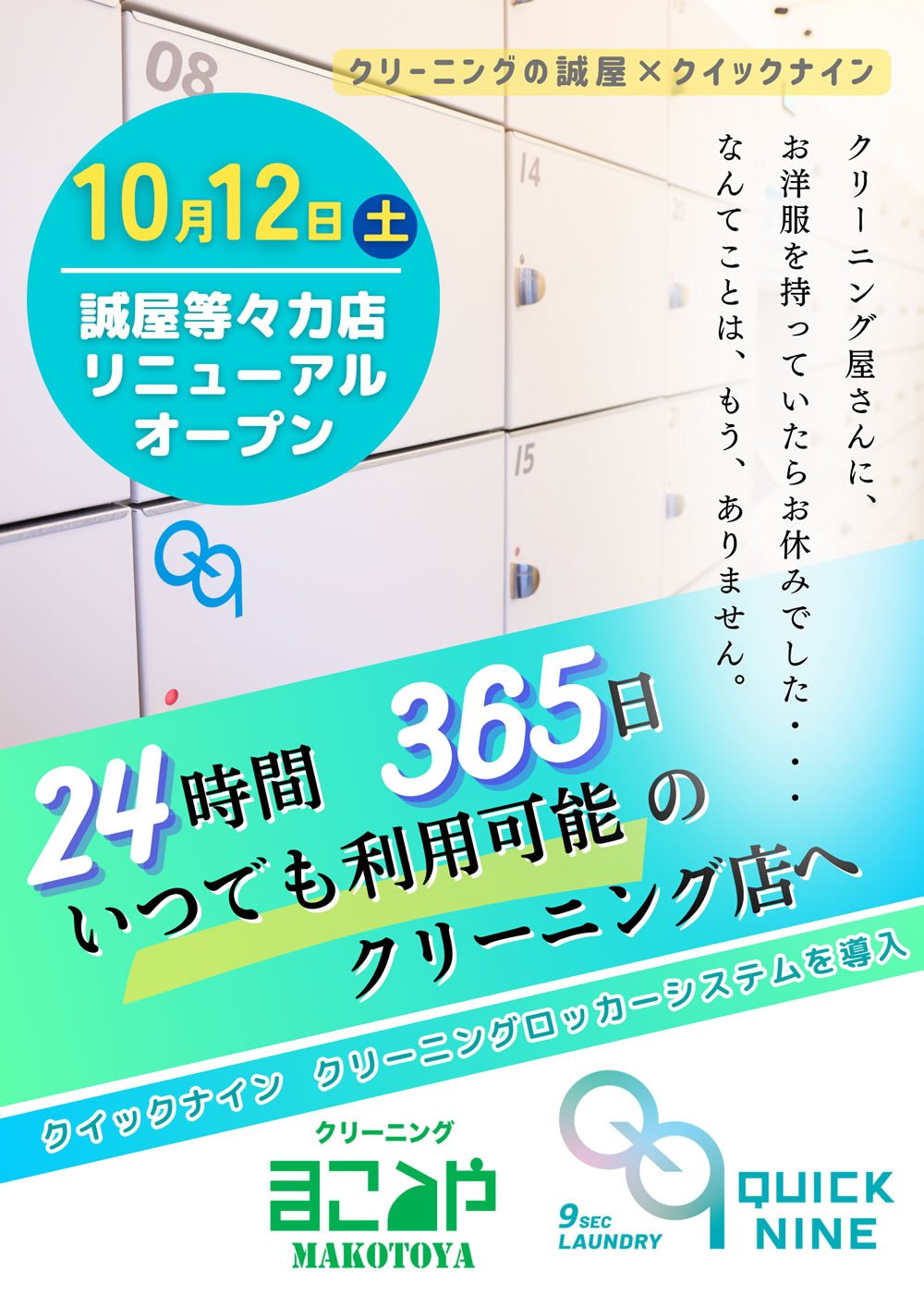 Quick nine 誠屋等々力店は、クリーニングロッカーシステムを導入し、24時間365日いつでも利用可能のクリーニング店に生まれ変わりました!