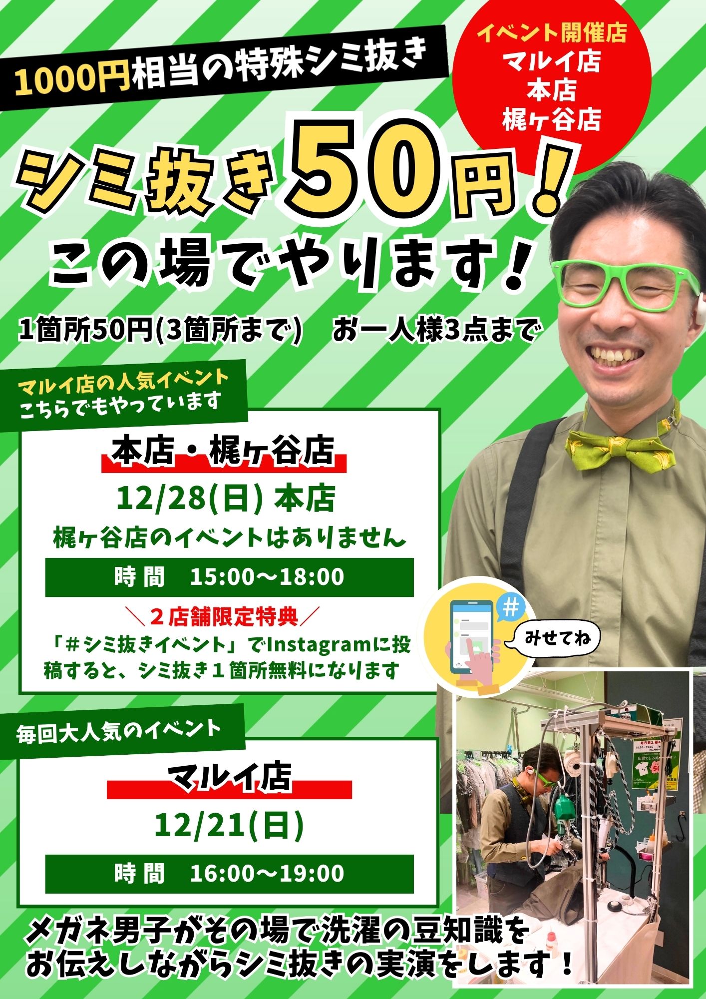 誠屋クリーニングの溝の口マルイ店で開催している、メガネ男子👓による大人気シミ抜きイベント『シミ抜き50円!この場でやります!』が・・・