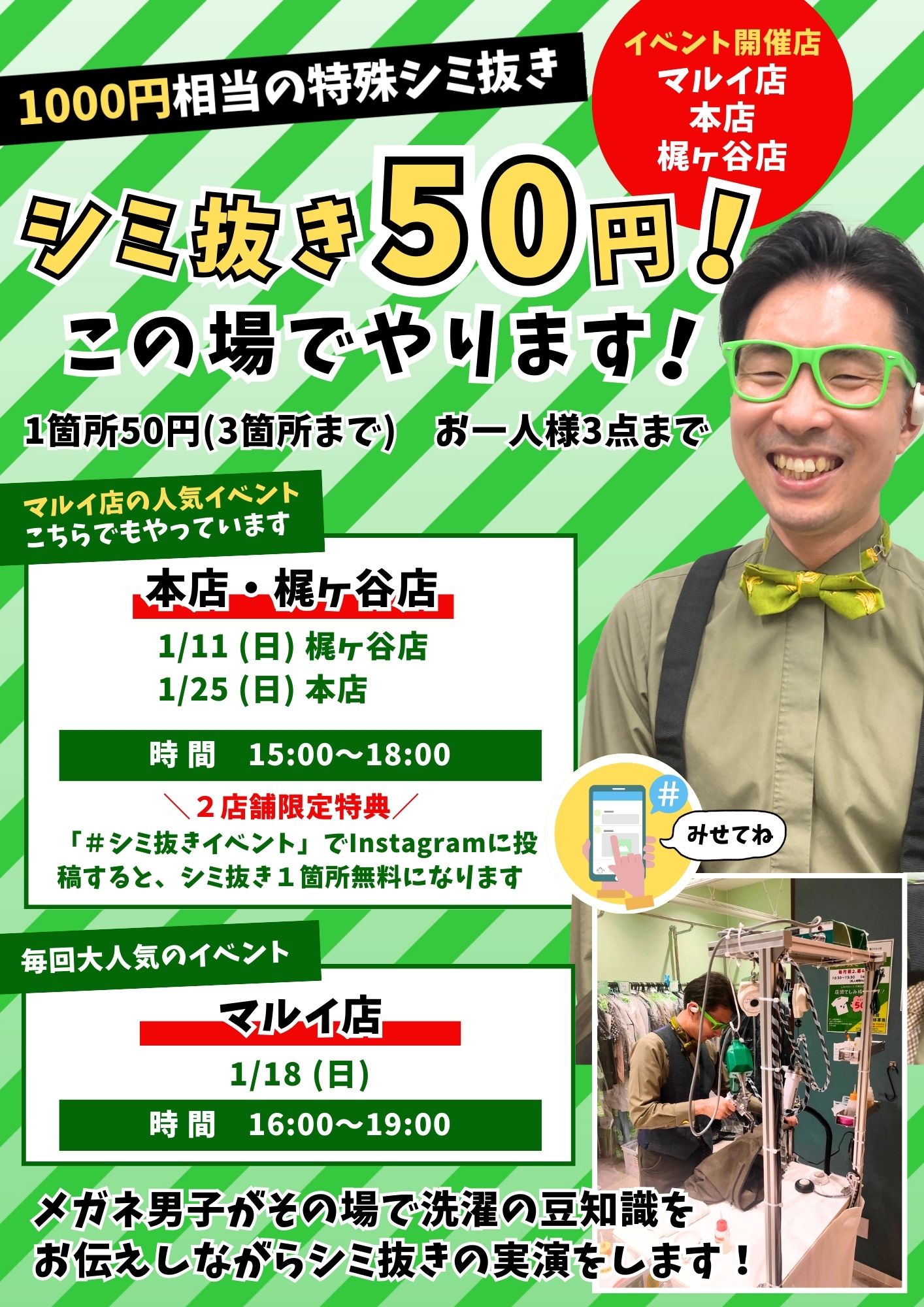 誠屋クリーニングの溝の口マルイ店で開催している、メガネ男子👓による大人気シミ抜きイベント『シミ抜き50円!この場でやります!』が・・・