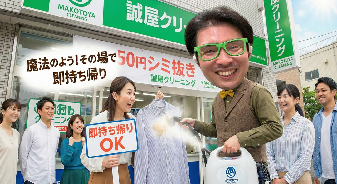 誠屋クリーニングの技術力を、まずはその目で確かめてください。 「本当に落ちるの?」「高いんじゃないの?」そんな不安を解消するために、私たちは店頭での実演を行っています。